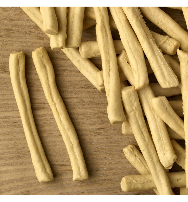 La croccantezza dei Grissoni tradizionali conquista fin dal primo morso: preparati con farina di grano tenero “00”, olio extravergine d’oliva e vino bianco, racchiudono il sapore genuino della Puglia in ogni pezzo. Perfetti da gustare come snack, per accompagnare i tuoi aperitivi o per aggiungere un tocco di autenticità alle tue tavole. Un prodotto artigianale che valorizza la semplicità e la bontà delle materie prime locali.