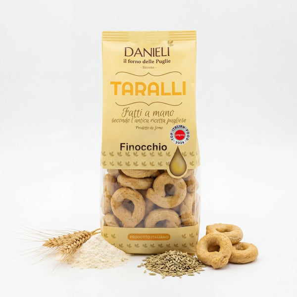 Lasciati conquistare dai taralli pugliesi al finocchio: croccanti, profumati e preparati rigorosamente a mano secondo l’antica tradizione. Il loro sapore autentico, arricchito dal finocchio, regala un’esperienza unica che profuma di Puglia....