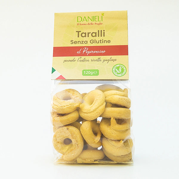 Lasciati conquistare dal gusto autentico dei taralli pugliesi senza glutine al peperoncino: fragranti, realizzati a mano secondo un’antica ricetta della tradizione, sono l’ideale per una pausa sfiziosa. L’intensità del peperoncino si unisce alla bontà degli ingredienti selezionati per regalare un’esperienza di sapore unica, tutta da condividere.